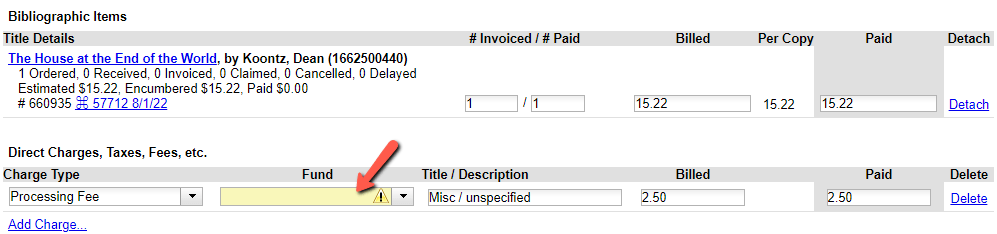 Your EDI invoice may contain processing fees or other charges. You will need to select the fund you want the charges to be paid out of for each charge on the invoice. See Direct Charges for more information.